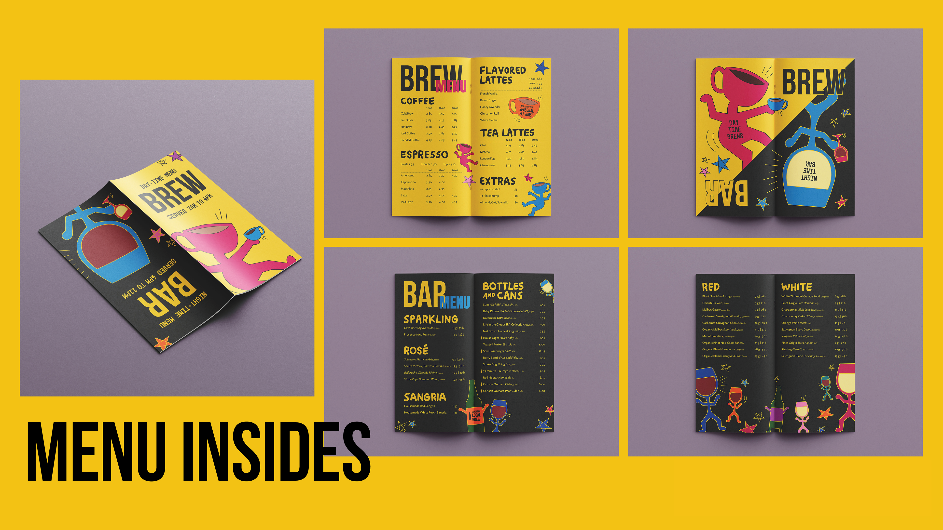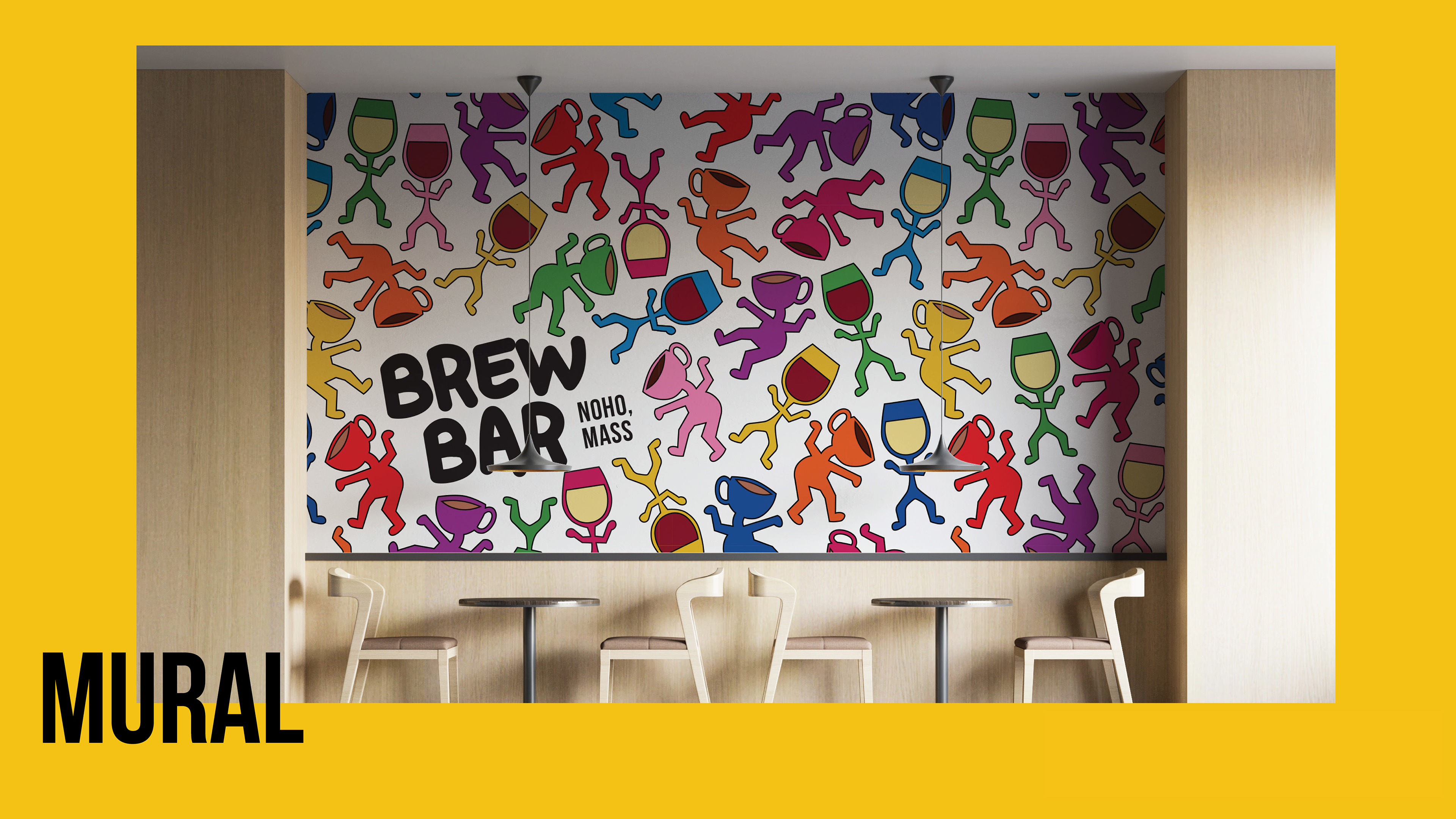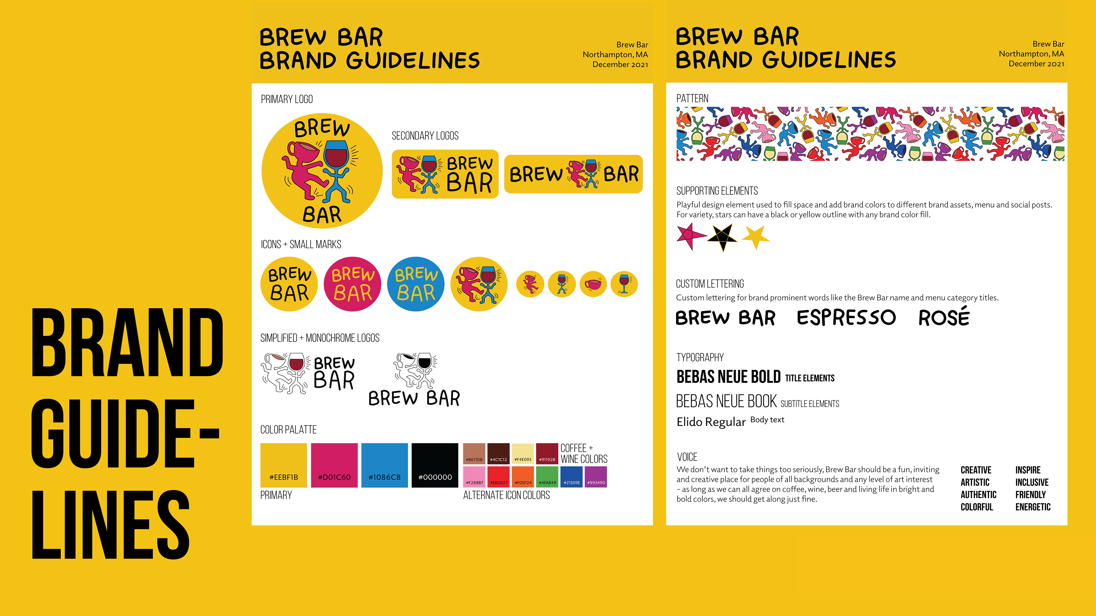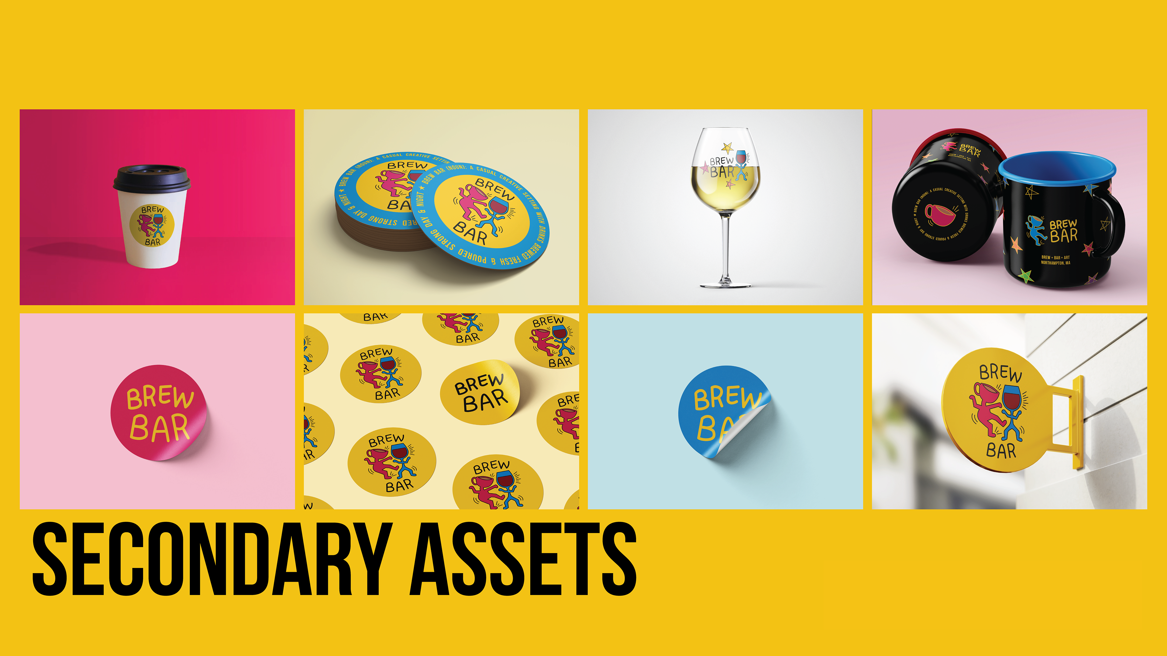 Brew Bar is a unique café, bar, and art space created as a creative hub for the Northampton community. The brand brings together three experiences—coffee culture, nightlife energy, and an open, inclusive art environment—while maintaining a natural flow as the space shifts from day to night. Its identity embraces bold colors, expressive typography, and a flexible visual system that feels playful, lived-in, and always evolving, reflecting the belief that art is for everyone.